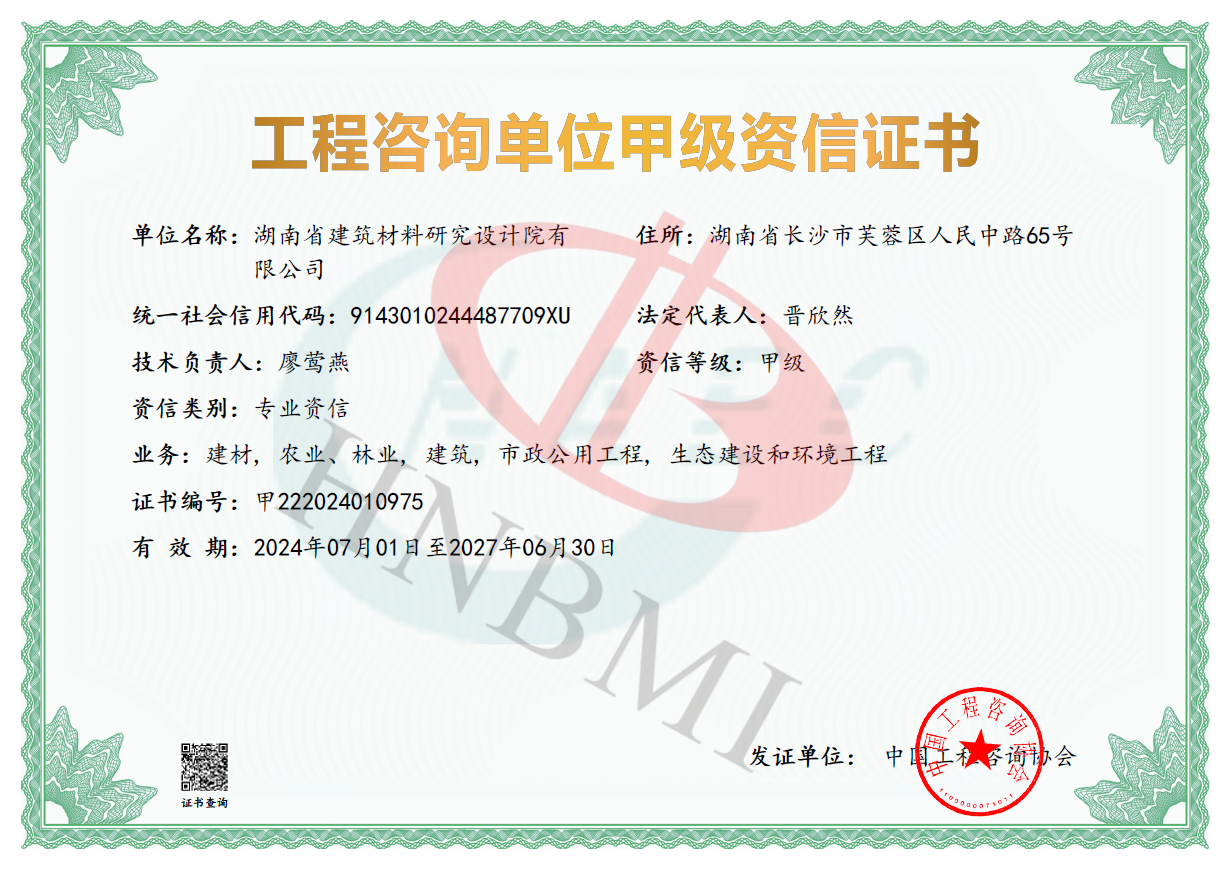 湖南省建筑材料研究設計院有限公司的前身為湖南省建筑材料研究設計院,成立于1958年,是1993年全國首批榮獲國家建材行業設計、工程總承包甲級資質的四個科研設計單位之一。